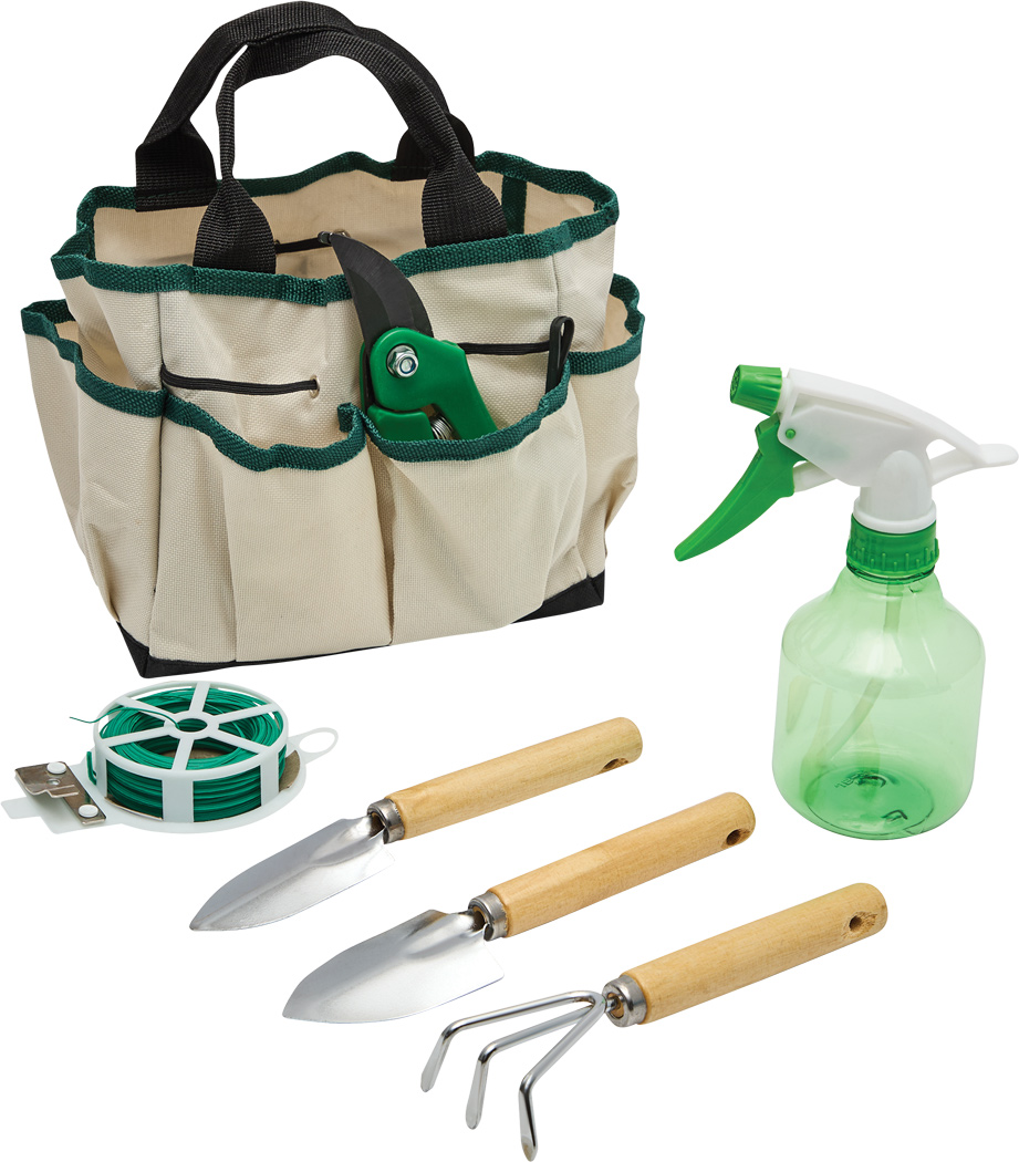 A: Un râteau, deux pelles, un sécateur, un vaporisateur et une bobine de fil.